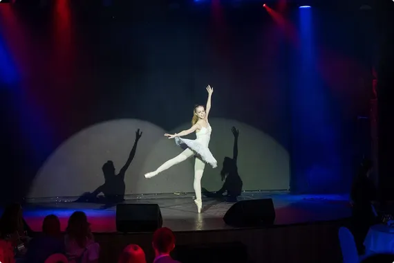 На сцене — балерина Алиса Гурьянова. Её танец открывает вечер: «гармония, баланс, риск и расчёт». Всё как в жизни страхователя.